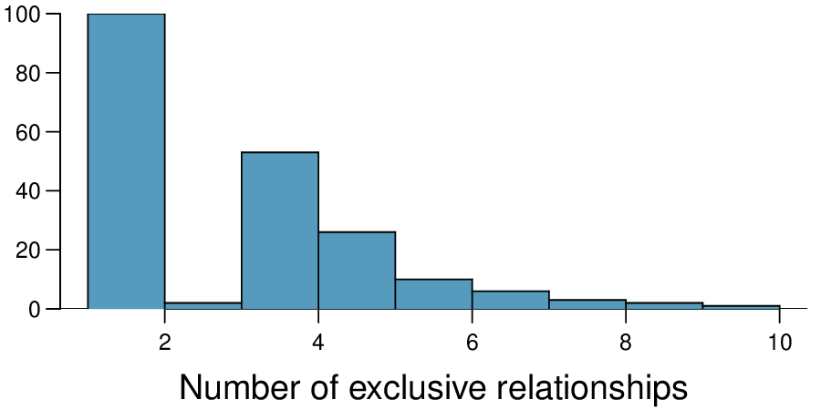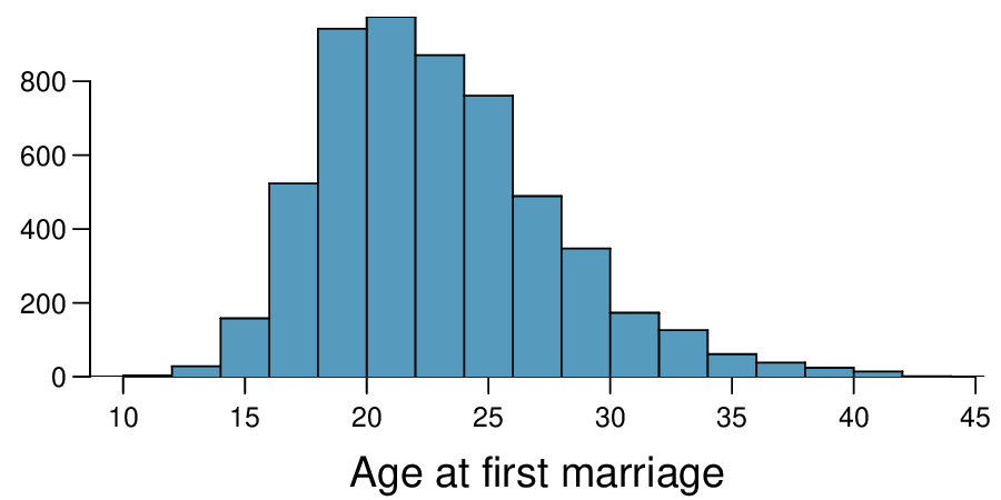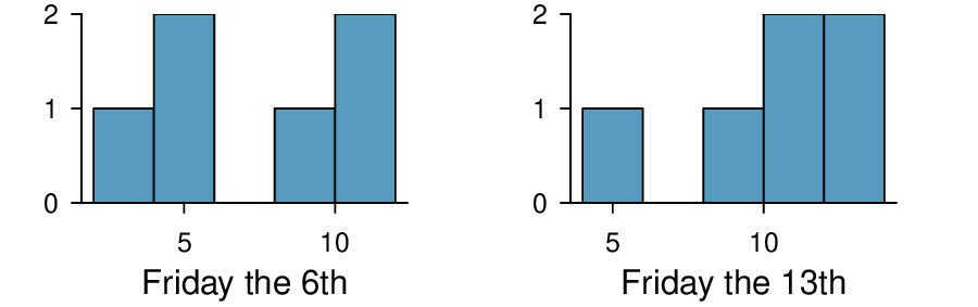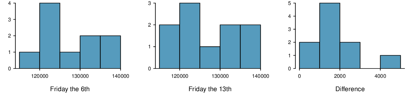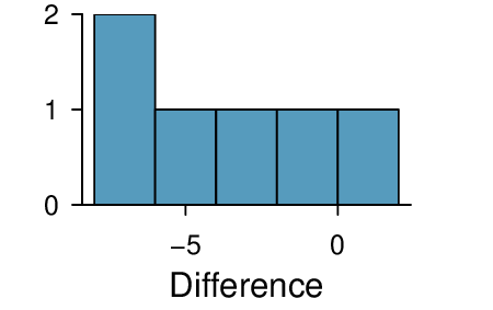 \(H_{0} : \mu_{T} = \mu_{C}\text{.}\) \(H_{A} : \mu_{T} \ne \mu_{C}\text{.}\) \(T = 2.24\text{,}\) \(df = 21 \rightarrow \text{p-value } = 0.036\text{.}\) Since \(\text{p-value } < 0.05\text{,}\) reject \(H_{0}\text{.}\) The data provide strong evidence that the average food consumption by the patients in the treatment and control groups are different. Furthermore, the data indicate patients in the distracted eating (treatment) group consume more food than patients in the control group.