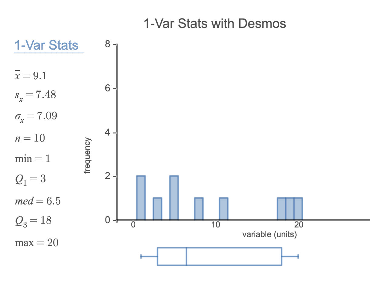 Dist 2 has a higher mean since \(20 \gt 13\text{,}\) and a higher standard deviation since 20 is further from the rest of the data than 13.