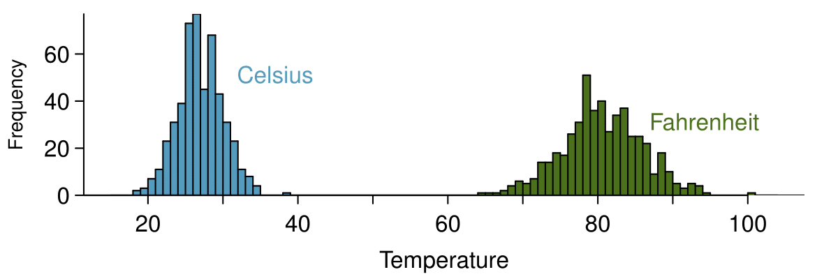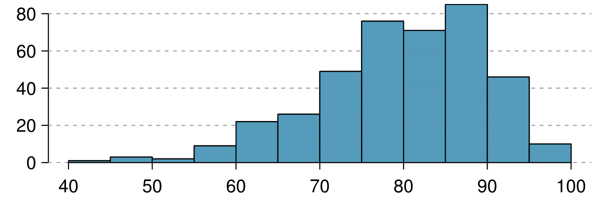 We can use Z-scores to roughly identify which observations are more unusual than others. An observation \(x_1\) is said to be more unusual than another observation \(x_2\) if the absolute value of its Z-score is larger than the absolute value of the other observation’s Z-score: \(|Z_1| > |Z_2|\text{.}\) This technique is especially insightful when a distribution is symmetric.