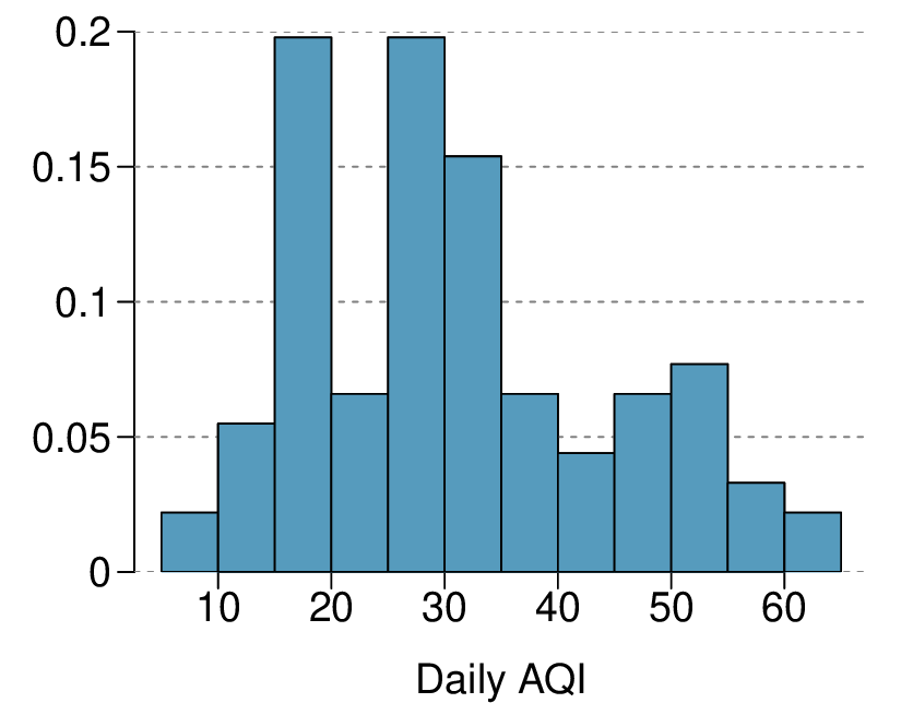 Daily air quality is measured by the air quality index (AQI) reported by the Environmental Protection Agency. This index reports the pollution level and what associated health effects might be a concern. The index is calculated for five major air pollutants regulated by the Clean Air Act and takes values from 0 to 300, where a higher value indicates lower air quality. AQI was reported for a sample of 91 days in 2011 in Durham, NC. The relative frequency histogram below shows the distribution of the AQI values on these days. 31