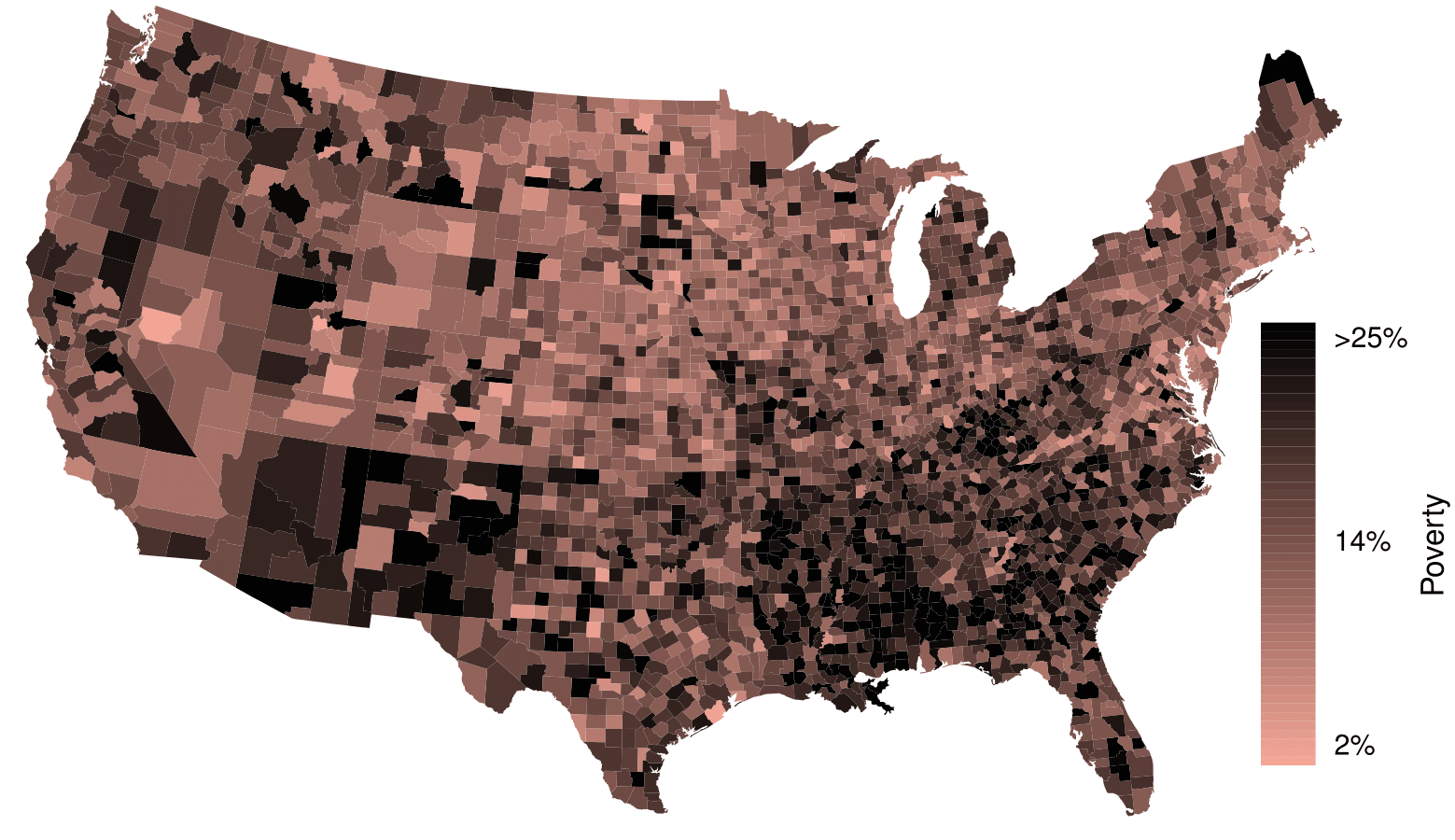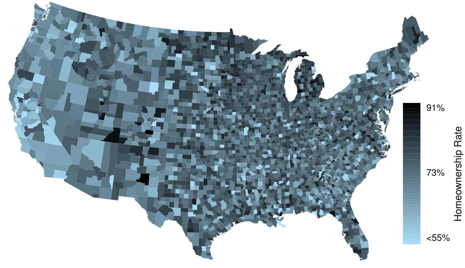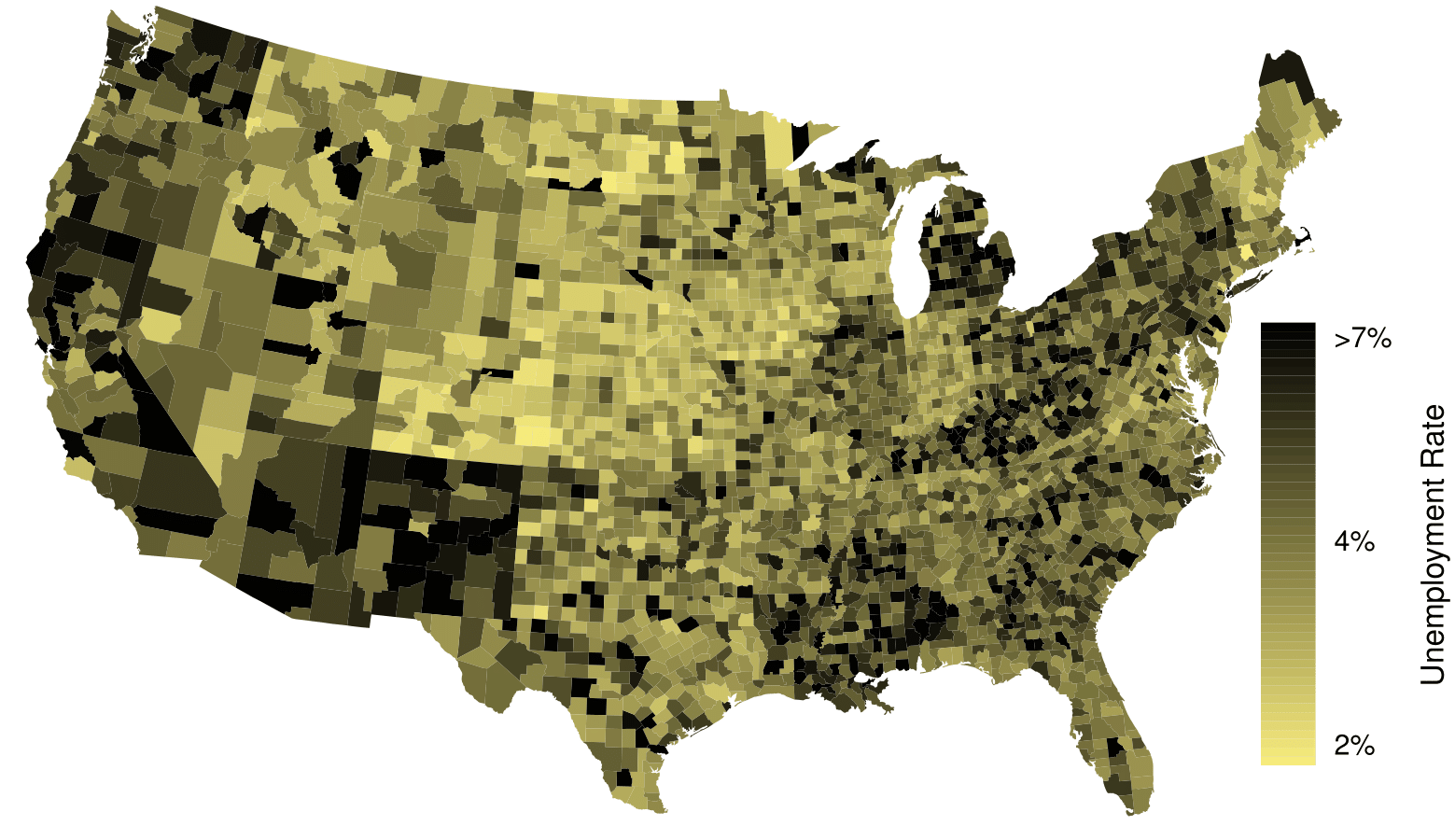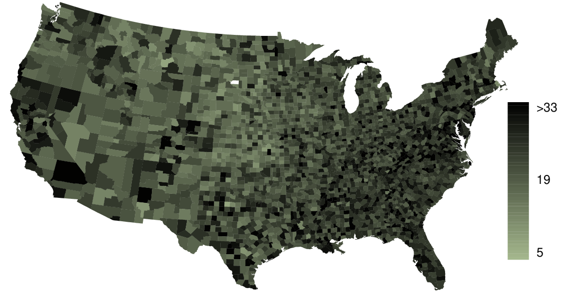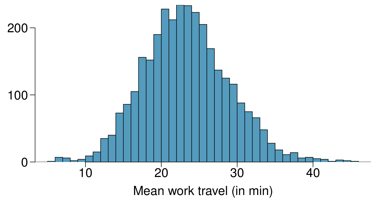 The US census collects data on time it takes Americans to commute to work, among many other variables. The histogram below shows the distribution of average commute times in 3,142 US counties in 2010. Also shown below is a spatial intensity map of the same data.
