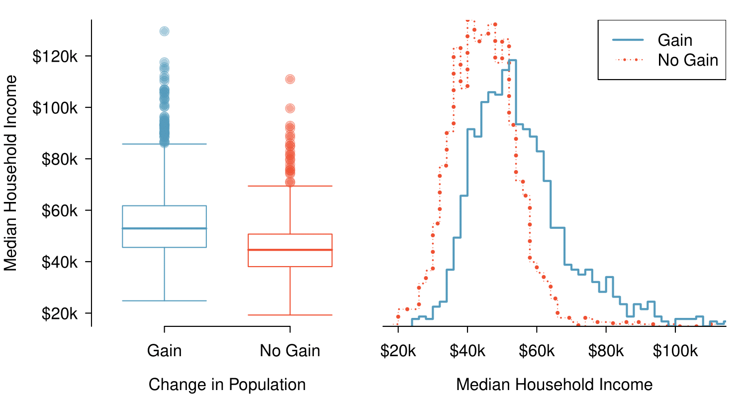 The county data set is special in that each county actually represents many individual people. If we were to simply average across the income variable, we would be treating counties with 5,000 and 5,000,000 residents equally in the calculations. Instead, we should compute the total income for each county, add up all the counties’ totals, and then divide by the number of people in all the counties. If we completed these steps with the county data, we would find that the per capita income for the US is $27,348.43. Had we computed the simple mean of per capita income across counties, the result would have been just $22,504.70!