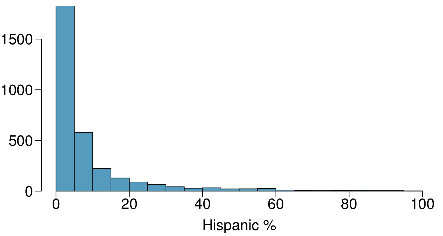 The US census collects data on race and ethnicity of Americans, among many other variables. The histogram below shows the distribution of the percentage of the population that is Hispanic/Latine in 3,142 counties in the US in 2017. Also shown is a histogram of logs of these values.