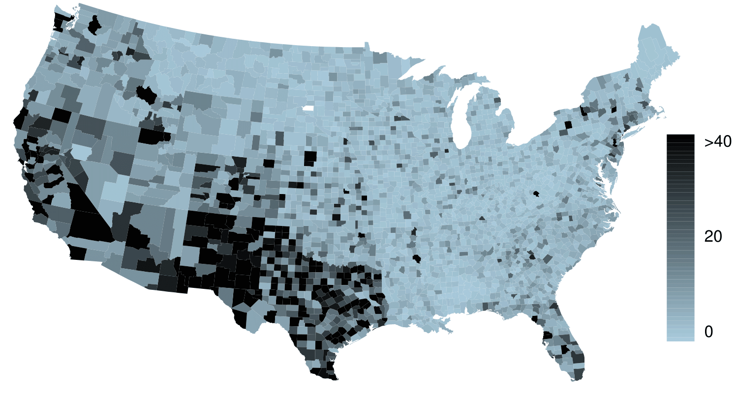 Describe the distribution of percent of population that is Hispanic/Latine for counties in the US.
