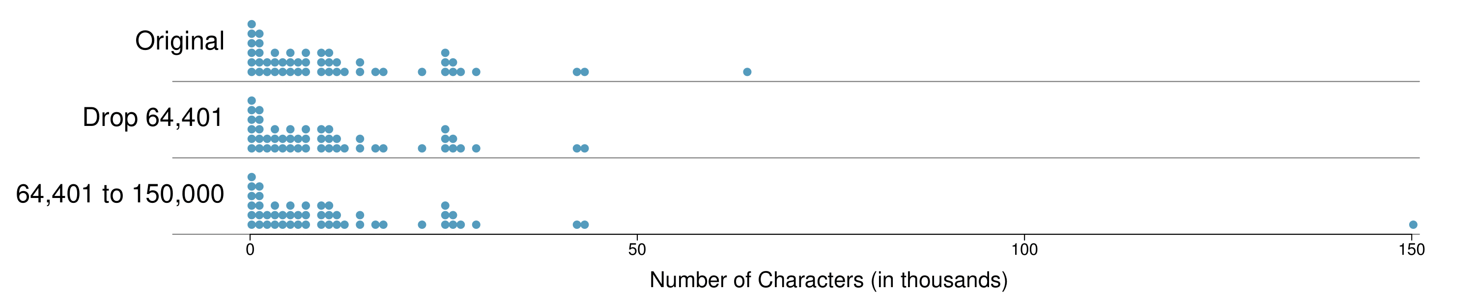 We call the distance of an observation from its mean its deviation. Below are the deviations for the \(1^{st}_{}\text{,}\)\(2^{nd}_{}\text{,}\)\(3^{rd}\text{,}\) and \(50^{th}_{}\) observations in the num_char variable. For computational convenience, the number of characters is listed in the thousands and rounded to the first decimal.