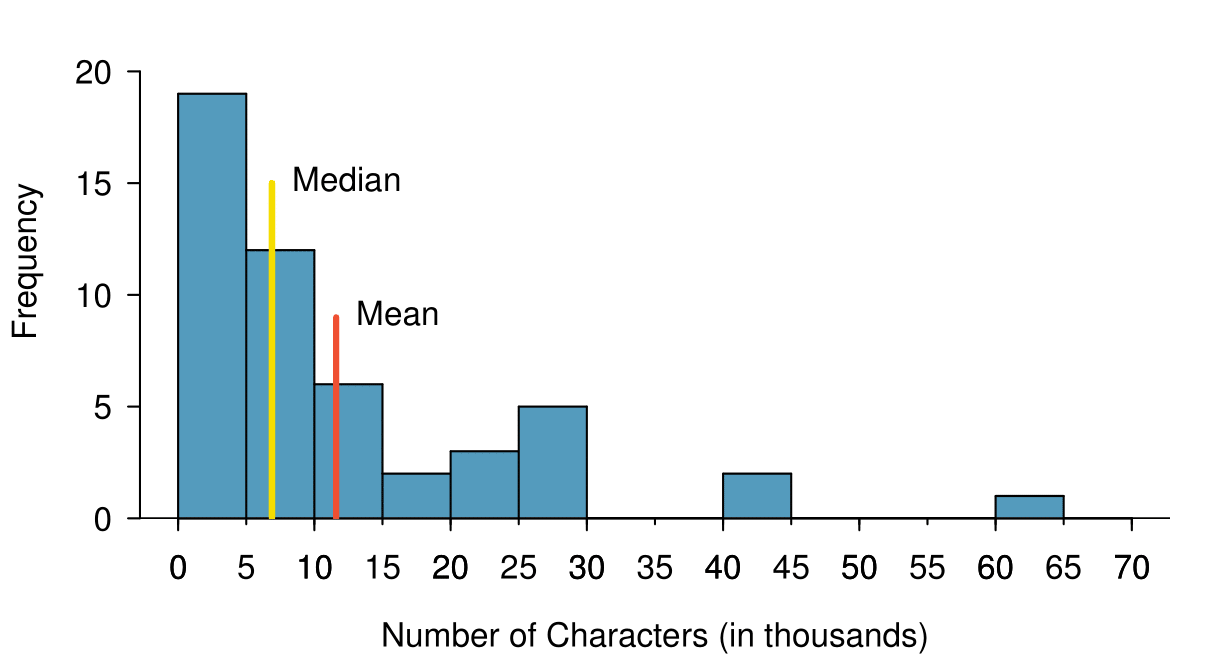 Figure2.2.5.A histogram of num_char with its mean and median shown.