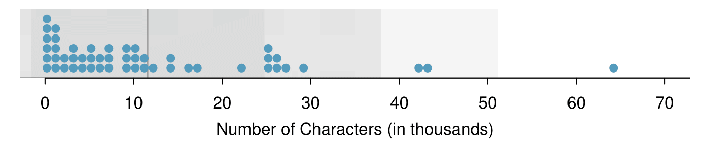Figure2.2.10.In the num_char data, 40 of the 50 emails (80%) are within 1 standard deviation of the mean, and 47 of the 50 emails (94%) are within 2 standard deviations. The empirical rule does not hold well for skewed data, as shown in this example.
