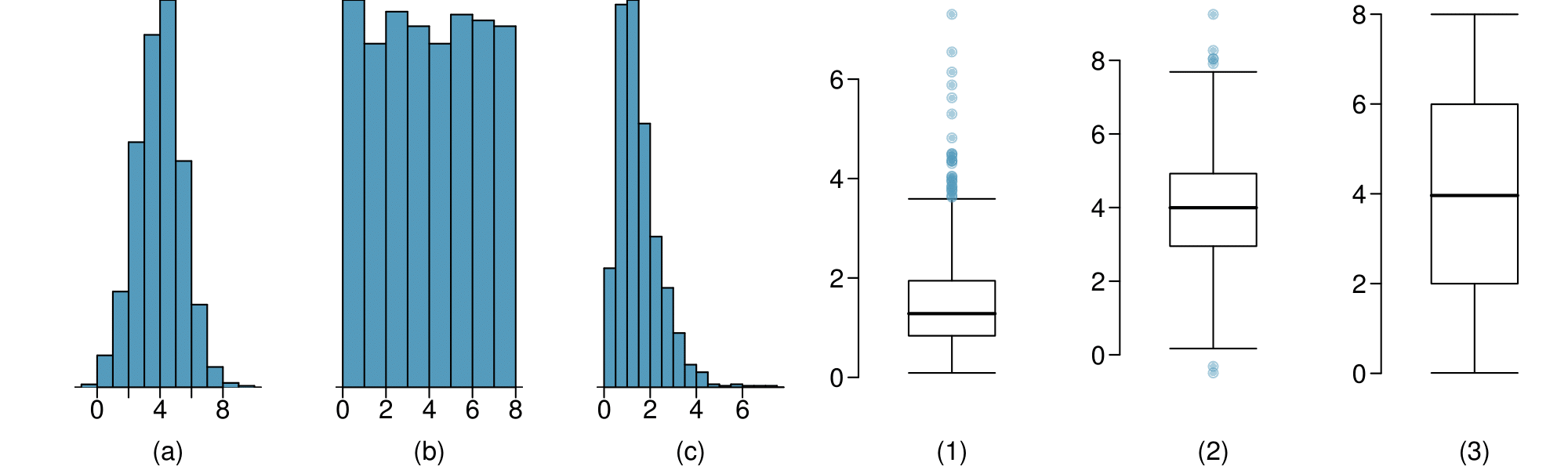 Figure 2.2.11 shows three distributions that look quite different, but all have the same mean, variance, and standard deviation. Using modality, we can distinguish between the first plot (bimodal) and the last two (unimodal). Using skewness, we can distinguish between the last plot (right skewed) and the first two. While a picture, like a histogram, tells a more complete story, we can use modality and shape (symmetry/skew) to characterize basic information about a distribution.
