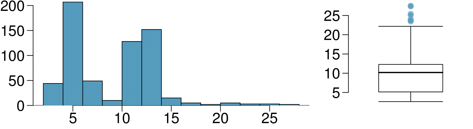 Compare the two plots below. What characteristics of the distribution are apparent in the histogram and not in the box plot? What characteristics are apparent in the box plot but not in the histogram?