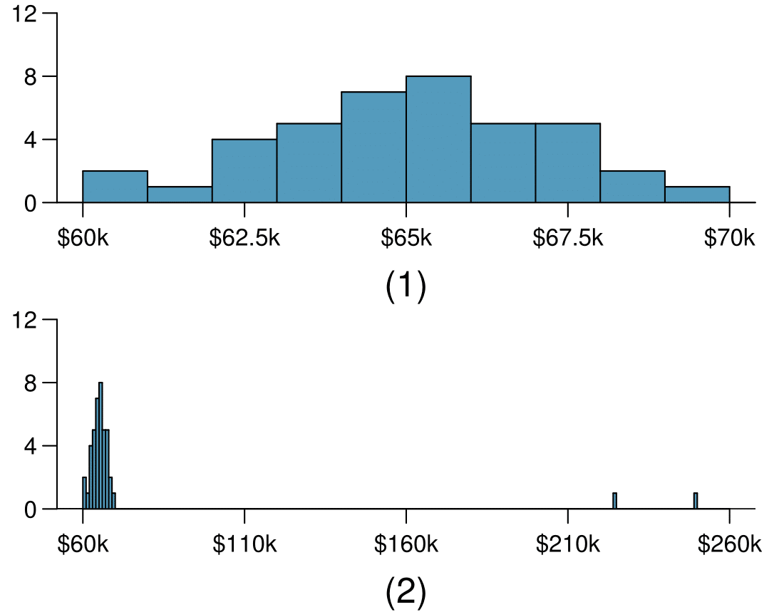The first histogram below shows the distribution of the yearly incomes of 40 patrons at a college coffee shop. Suppose two new people walk into the coffee shop: one making $225,000 and the other $250,000. The second histogram shows the new income distribution. Summary statistics are also provided.