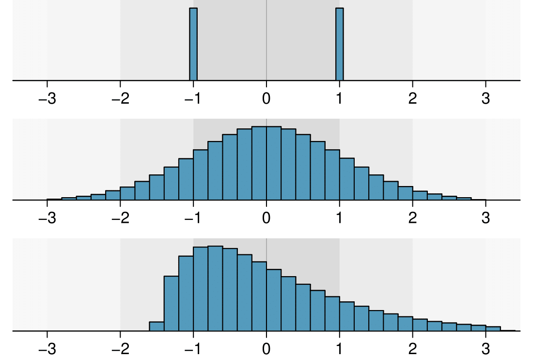 Figure2.2.11.Three very different population distributions with the same mean \(\mu=0\) and standard deviation \(\sigma=1\text{.}\)