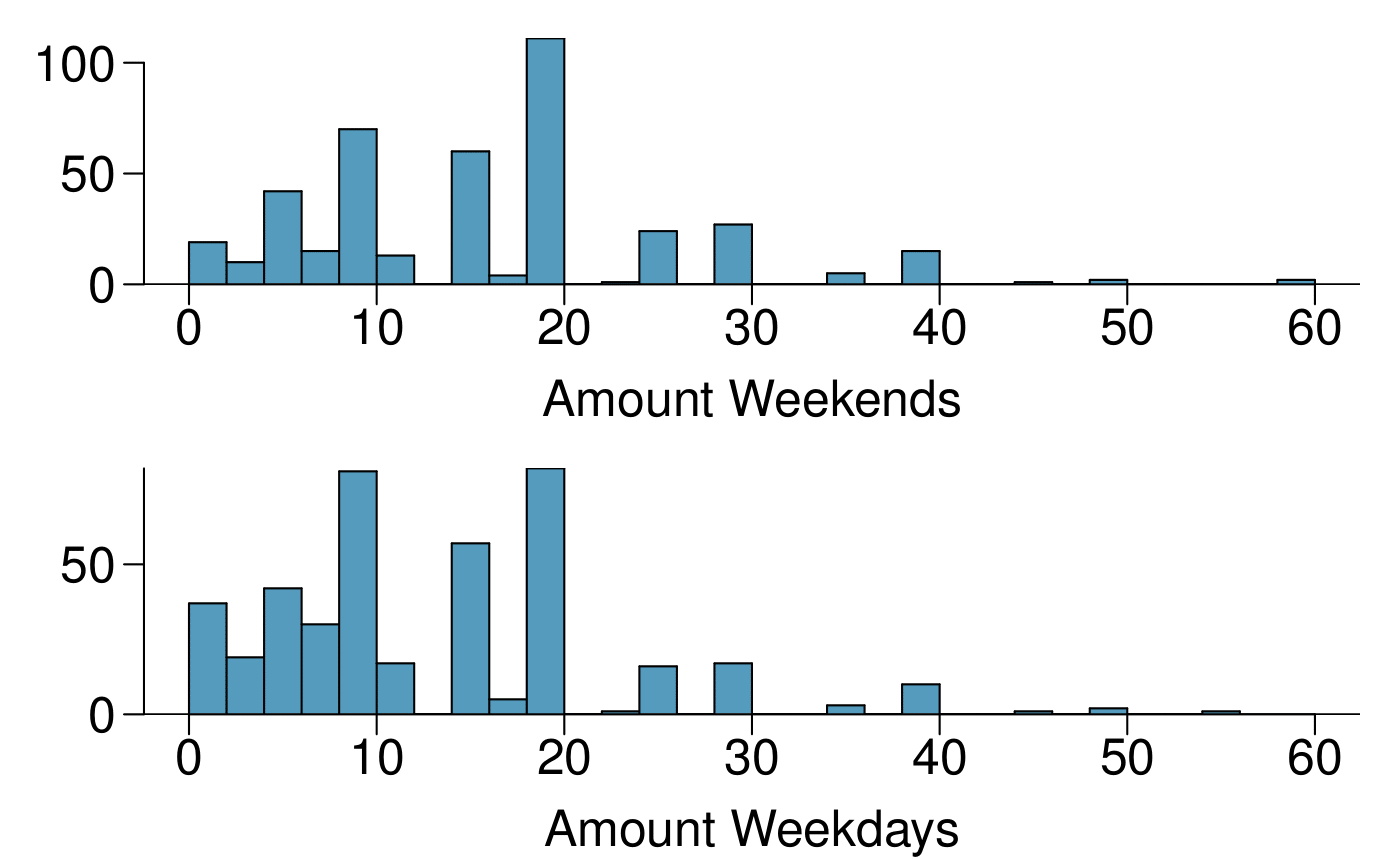 In Chapter 4, we encounter a bell-shaped distribution known as the normal distribution. The empirical rule tells us that for normal distributions, about 68% of the data will be within one standard deviation of the mean, about 95% will be within two standard deviations of the mean, and about 99.7% will be within three standard deviations of the mean. However, as seen in Figure 2.2.10 and Figure 2.2.11, these percentages generally do not hold if the distribution is not bell-shaped.